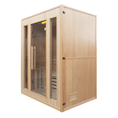 Its accessories kit includes a bucket, a ladle, a thermometer and a hygrometer. To ensure an ideal temperature, a Harvia stove and 20 kg of lava stones are included.